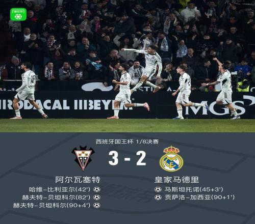西班牙国王杯1/8决赛爆出惊天冷门,皇家马德里遭遇补时绝杀,客场2-3负于西乙球队阿尔瓦塞特被淘汰出局。皇马在...